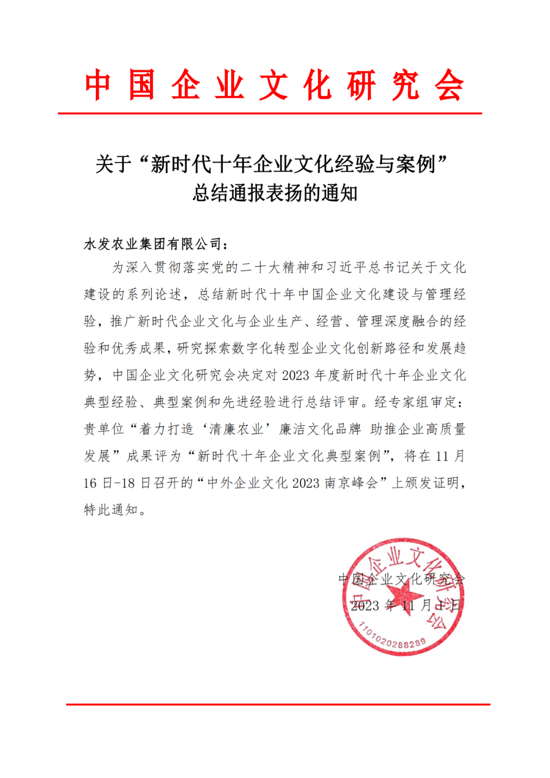 近日,經(jīng)中國企業(yè)文化研究會(huì)專家組審定,水發(fā)農(nóng)業(yè)集團(tuán)申報(bào)的《著力打造“清廉農(nóng)業(yè)”廉潔文化品牌助推企業(yè)高質(zhì)量發(fā)展》成果,被評(píng)為“新時(shí)代十年企業(yè)文化典型案例”并將在即將召開的“中外企業(yè)文化2023南京峰會(huì)”予以通報(bào)表揚(yáng)。